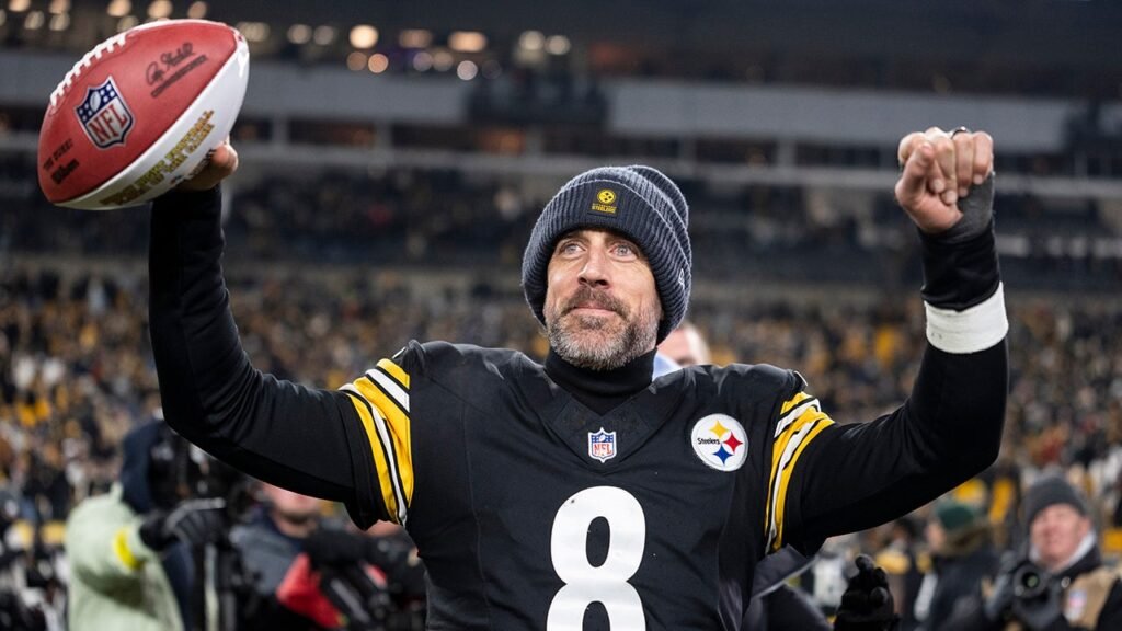 Aaron Rodgers of the Pittsburgh Steelers celebrates following an NFL football game against the Baltimore Ravens at Acrisure Stadium on Jan. 4, 2026 in Pittsburgh, Pennsylvania. (Michael Owens/Getty Images)