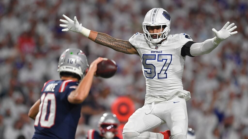 Buffalo Bills defensive end A.J. Epenesa (57) pressures New England Patriots quarterback Drake Maye (10) during the first half of an NFL football game, Sunday, Sept. 5, 2025, in Orchard Park, New York. (AP Photo/Adrian Kraus)