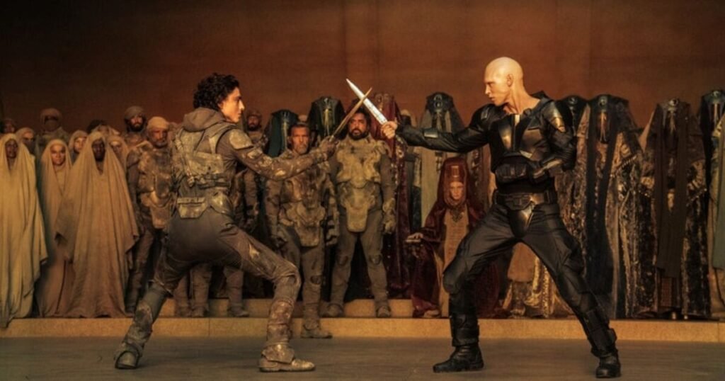Paul Atreides (Timothée Chalamet) faces off with Feyd-Rautha (Austin Butler) in Dune Part Two (Image: SCU/Warner Bros)