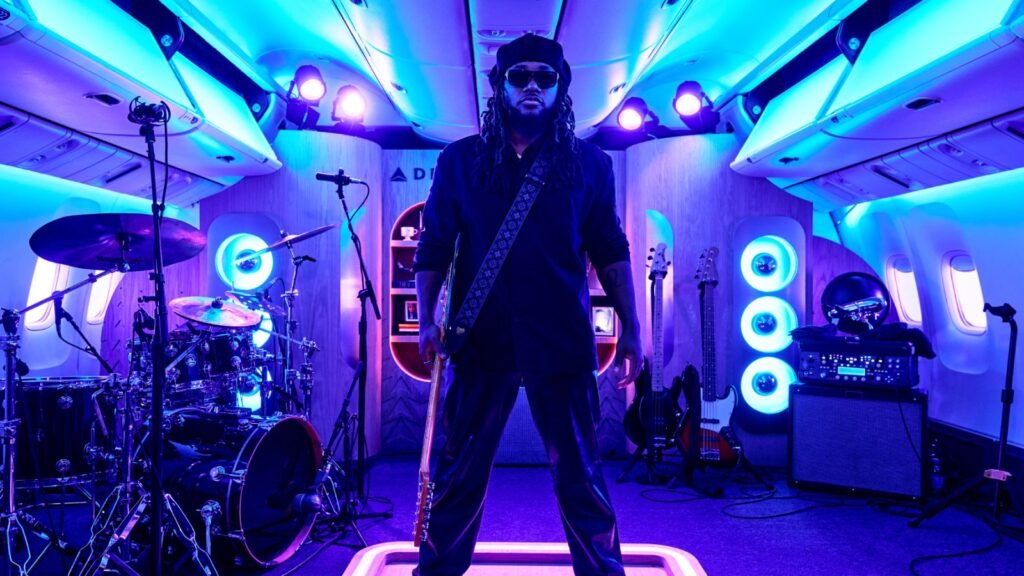 While turning a jet cabin into a stage makes for a unique setting in and of itself, Thomas credits his creative team for enhancing the atmosphere and “making sure we brought my world onto this plane.” Of the overall experience, he adds, “Certain times in your life, you can dream up certain things, and this one I didn’t necessarily have on my bingo card for 2026. It was a great opportunity to perform in a space that was unorthodox and really cool. I think creative ideas like this help celebrate artists.”