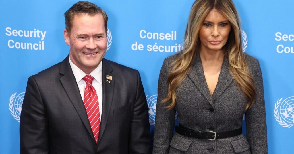 The first lady arrived at the U.N. headquarters and posed for photos with other leaders on Monday, including with U.S. Ambassador to the United Nations Mike Waltz.