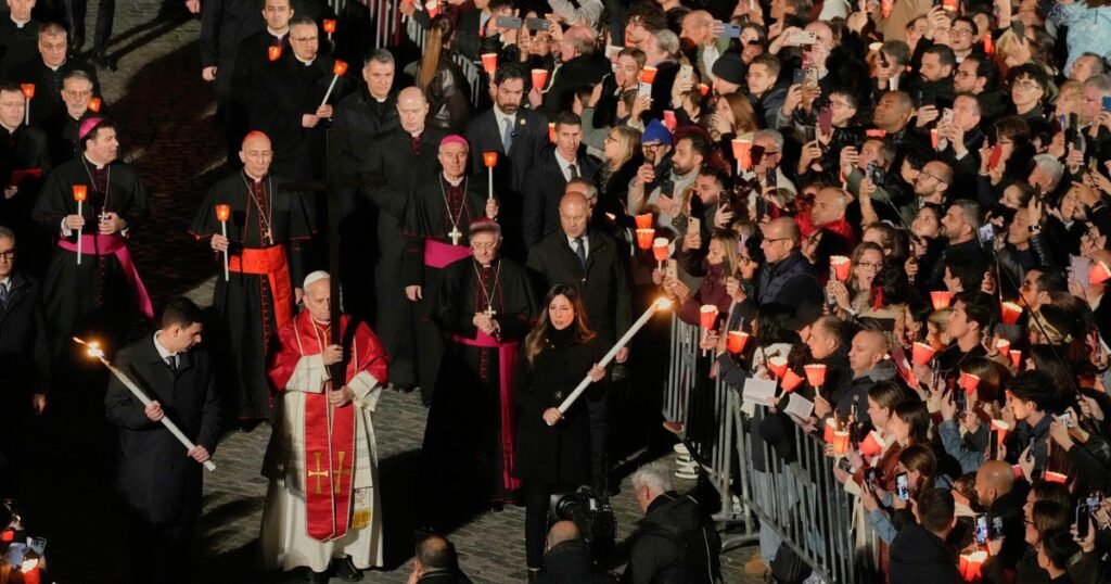 Pope Francis never carried the cross, but participated in the procession until his health worsened. He died after a long illness last year on Easter Monday, which fell on April 21.